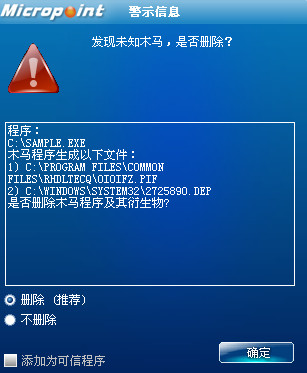 已安装使用微点主动防御软件的用户,无须任何设置,微点主动防御将自动保护您的系统免受该病毒的入侵和破坏。无论您是否已经升级到最新版本,微点主动防御都能够有效清除该病毒。如果您没有将微点主动防御软件升级到最新版,微点主动防御软件在发现该病毒后将报警提示您发现“未知木马”,请直接选择删除处理(如图1)
