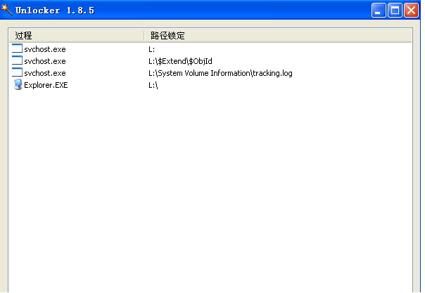 将移动硬盘接入USB后,拷完资料,发现无法弹出USB设备,且硬盘盒的红色指示灯长亮,移动硬盘盘符分别为H/J/L,在L盘符上点右键Unlocker, 发现L盘内有多个文件正在运行,如图:
