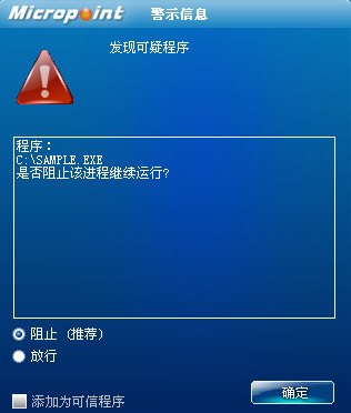 已安装使用微点主动防御软件的用户,无须任何设置,微点主动防御将自动保护您的系统免受该病毒的入侵和破坏。无论您是否已经升级到最新版本,微点主动防御都能够有效清除该病毒。如果您没有将微点主动防御软件升级到最新版,微点主动防御软件在发现该病毒后将报警提示您发现“可疑程序”,请直接选择删除处理(如图1)