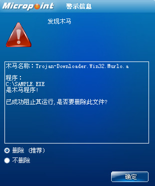 如果您已经将微点主动防御软件升级到最新版本,微点将报警提示您发现木马"Trojan-Downloader.Win32.Murlo.a”,请直接选择删除(如图2)。