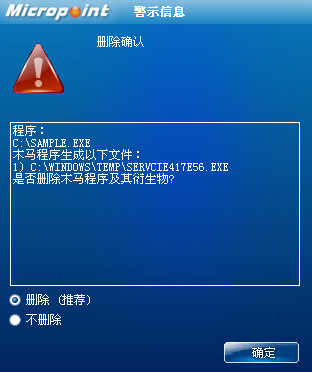 已安装使用微点主动防御软件的用户,无须任何设置,微点主动防御将自动保护您的系统免受该病毒的入侵和破坏。无论您是否已经升级到最新版本,微点主动防御都能够有效清除该病毒。如果您没有将微点主动防御软件升级到最新版,微点主动防御软件在发现该病毒后将报警提示您发现“可疑程序”,请直接选择删除处理(如图1)
