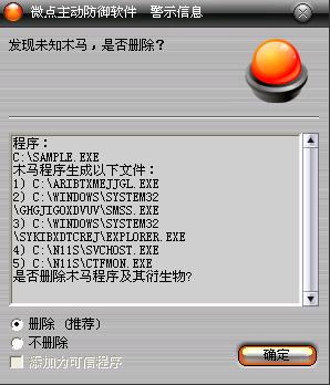 已安装使用微点主动防御软件的用户,无须任何设置,微点主动防御将自动保护您的系统免受该病毒的入侵和破坏。无论您是否已经升级到最新版本,微点主动防御都能够有效清除该病毒。如果您没有将微点主动防御软件升级到最新版,微点主动防御软件在发现该病毒后将报警提示您发现“未知木马”,请直接选择删除处理(如图1)