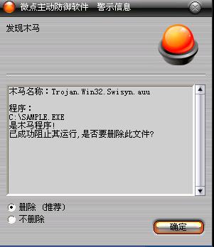 如果您已经将微点主动防御软件升级到最新版本,微点将报警提示您发现木马"Trojan.Win32.Swisyn.auu”,请直接选择删除(如图2)。