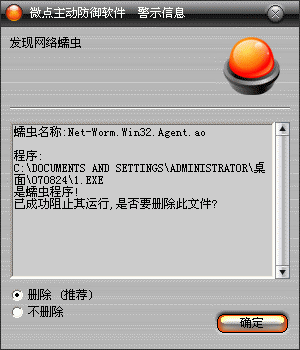 如果您已经将微点主动防御软件升级到最新版本,微点将报警提示您发现Net-Worm.Win32.Agent.ao”,请直接选择删除(如图2)。