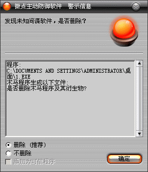 已安装微点主动防御软件的用户,无论您是否已经升级到最新版本,微点主动防御都能够有效防御该蠕虫程序。如果您没有将微点主动防御软件升级到最新版,微点主动防御软件在发现该病毒后将报警提示您“发现未知间谍”,请直接选择删除处理(如图1);