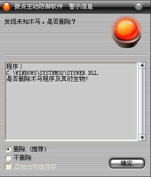 已安装使用微点主动防御软件的用户,无须任何设置,微点主动防御将自动保护您的系统免受该病毒的入侵和破坏。无论您是否已经升级到最新版本,微点主动防御都能够有效清除该病毒。如果您没有将微点主动防御软件升级到最新版,微点主动防御软件在发现该病毒后将报警提示您发现“未知木马”,请直接选择删除处理(如图1)