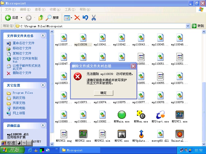 运行了一些样本,也开启了几次影子系统,在影子模式下手动结束过几次微点的进程,退出影子系统后重新开机,偶然发现微点文件夹里的一些文件可以随意删除包括MP1,2,3...Clean.exe,Download.exe,Uninstall.exe,MPStart.exe等,部分.dll删除时的警示发生变化,如图。重新启动正常。