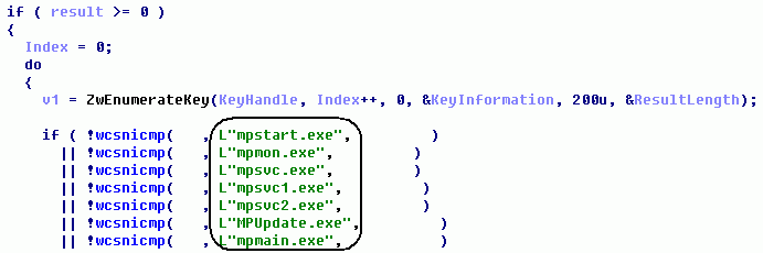 MP对驱动的监视不是很严格,搞个一般的驱动,hook掉几个更底的操作注册表的函数CmXXXX, 让MP在调用ZwOpenKey、ZwEnumerateKey、ZwDeleteKey这些函数时失效,然后加个DPC反复回写IFEO,劫持掉微点的MPUpdate.exe,只要微点一升级,病毒就运行一次, 然后病毒再启动微点的升级程序...