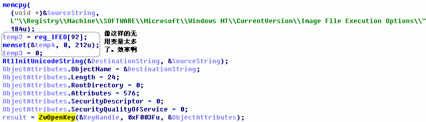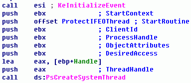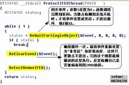 然后很神奇的发现,微点在宏观上对付病毒的IFEO劫持伎俩还是不错的: 开启一个系统线程,反复的检测自己是否被劫持.很无语...