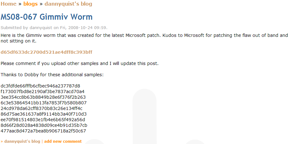 NOTICE: October 23, 2008: Today the MSRC released Security Bulletin MS08-067. For more information on this bulletin, and to stay protected get the latest information from the MMPC here on our blog: http://blogs.technet.com/mmpc/ar ... -protected-now.aspx