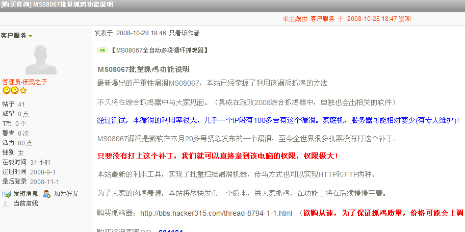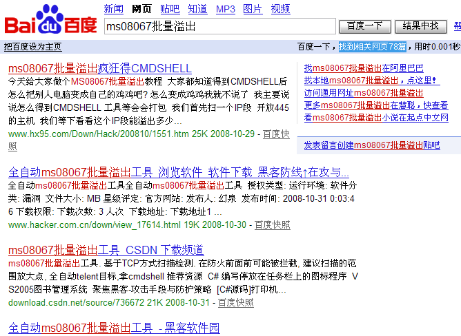 微软在2008年10月24日凌晨 太平洋标准时间下午1点举行网络直播会议紧急发布一个最高级别为严重的安全补丁ms08-067,用以修复已发现的Windows Server service 的漏洞并可能被利用于远程攻击或散播蠕虫. 攻击成功者可能获取系统的完全控制权限.