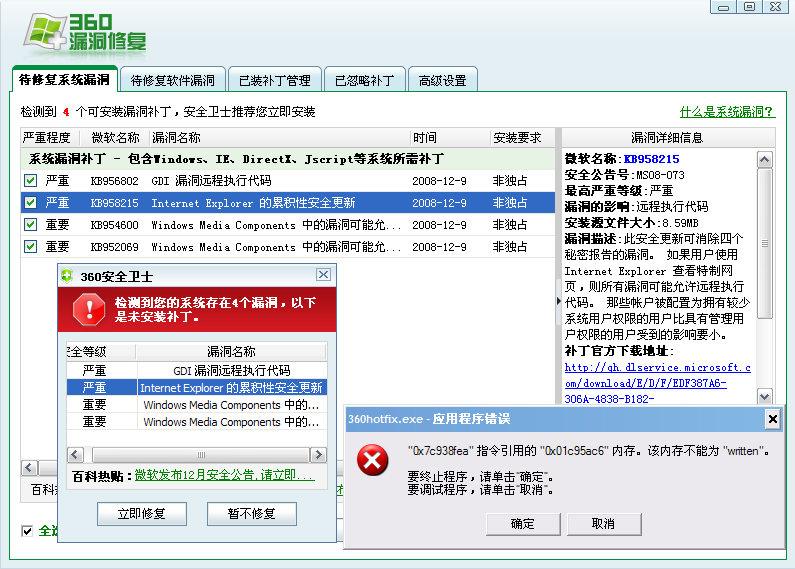 不过经笔者测试发现,这个新爆出的IE高危0day漏洞美国微软仍然没有发布针对此漏洞的补丁,安装刚刚发布的12月安全更新并不能消除该漏洞。估计微软最快也需要1周后才能出解决方案...