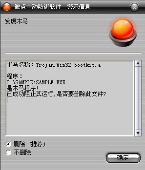如果您已经将微点主动防御软件升级到最新版本,微点将报警提示您发现木马"Trojan.Win32.bootkit.a”,请直接选择删除(如图2)。