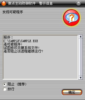 已安装使用微点主动防御软件的用户,无须任何设置,微点主动防御将自动保护您的系统免受该病毒的入侵和破坏。无论您是否已经升级到最新版本,微点主动防御都能够有效清除该病毒。如果您没有将微点主动防御软件升级到最新版,微点主动防御软件在发现该病毒后将报警提示您发现“可疑程序“,请直接选择删除处理(如图1);