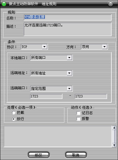 但在防火墙看来确是存在隐患的策略。传统防火墙是基于包过滤技术的,最安全的规则是只允许信任的数据包通过,其它数据包全部拦截。如果想要放行vpn的话,也应该是规则中设置允许固定远程vpn的 ip地址的1723端口数据包通过,因为只有你要访问的vpn的ip的数据包才是你信任的。