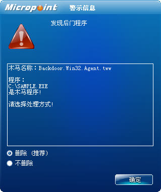 如果您已经将微点主动防御软件升级到最新版本,微点将报警提示您发现后门程序"Backdoor.Win32.Agent.tww”,请直接选择删除(如图2)。