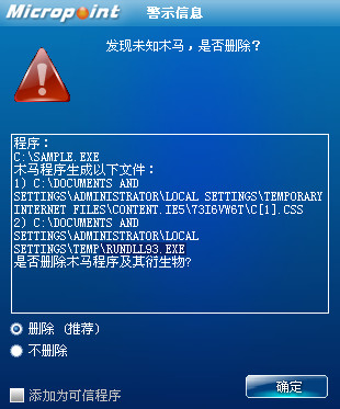 已安装使用微点主动防御软件的用户,无须任何设置,微点主动防御将自动保护您的系统免受该病毒的入侵和破坏。无论您是否已经升级到最新版本,微点主动防御都能够有效清除该病毒。如果您没有将微点主动防御软件升级到最新版,微点主动防御软件在发现该病毒后将报警提示您“发现未知木马”,请直接选择删除处理(如图1)