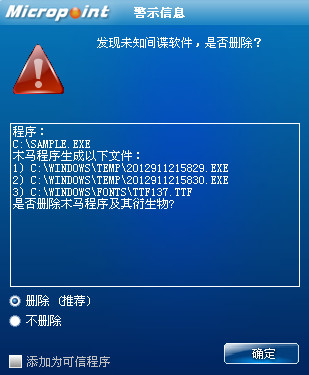 图1 微点主动防御软件自动捕获未知病毒(未升级)