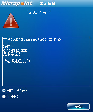 如果您已经将微点主动防御软件升级到最新版本,微点将报警提示您发现后门程序"Backdoor.Win32.DDoS.bk”,请直接选择删除(如图2)。