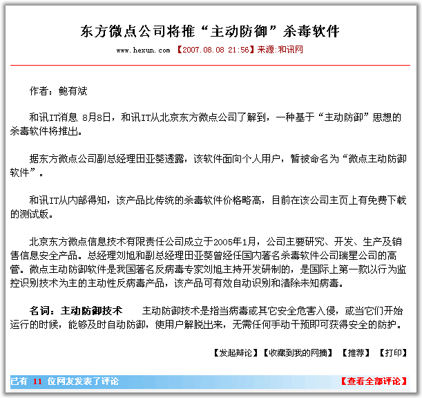 北京东方微点信息技术有限责任公司成立于2005年1月,公司主要研究、开发、生产及销售信息安全产品。总经理刘旭和副总经理田亚葵曾经任国内著名杀毒软件公司瑞星公司的高管。微点主动防御软件是我国著名反病毒专家刘旭主持开发研制的,是国际上第一款以行为监控识别技术为主的主动性反病毒产品,该产品可有效自动识别和清除未知病毒。