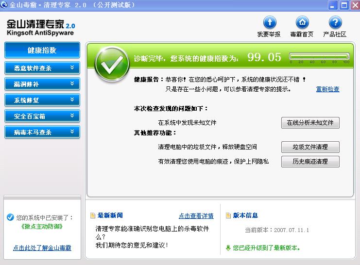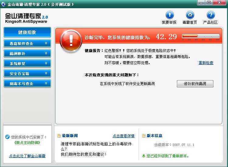 哈哈哈,多谢两位的截图,对比终于明白,金山判断系统安全度原来太多依赖漏洞修补情况啦。微点本身就有防漏洞溢出攻击的功能(安全日志-溢出日志),打不打补丁已经不是什么很重要的事情啦。金山还再把漏洞看的那么重要,诶,落后啊