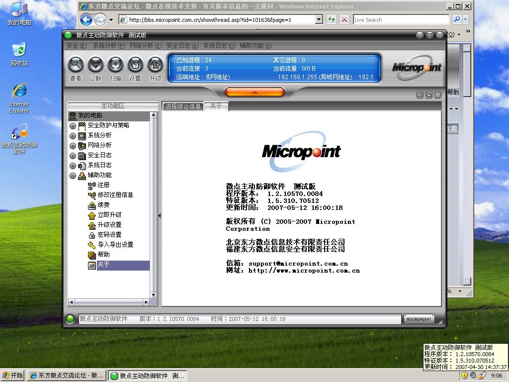 由于无节制地试用各种应用程序,我的xp终于出现崩溃的迹象,下定决心ghost,告别那些乱七八糟的软件:)。很快全新的桌面又回来了,先打好补丁,再装微点,==,听说看一款杀软真实的内存占用要对比安装前和安装后的内存使用来评价,我连忙看了看任务管理器,PF使用率是158MB,好了,这才上网下载微点最新安装包,安装,升级,稳定后打开任务管理器,晕,PF使用率怎么才145MB??呵呵,看来这个评价方法也不可靠。转眼一看托盘图标,最新更新时间4月30日,我重装前的更新时间可是5月7日哦,呵呵,可爱的点点,你的程序员还是没把你的这个小毛病纠正过来,打开主界面一看,哈哈,上面的更新时间是5月12日,晕晕,还是抓个图吧