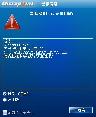 已安装使用微点主动防御软件的用户,无须任何设置,微点主动防御将自动保护您的系统免受该病毒的入侵和破坏。无论您是否已经升级到最新版本,微点主动防御都能够有效清除该病毒。如果您没有将微点主动防御软件升级到最新版,微点主动防御软件在发现该病毒后将报警提示您发现“未知木马”,请直接选择删除处理(如图1)