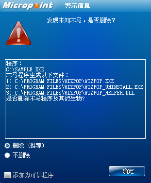 已安装使用微点主动防御软件的用户,无须任何设置,微点主动防御将自动保护您的系统免受该病毒的入侵和破坏。无论您是否已经升级到最新版本,微点主动防御都能够有效清除该病毒。如果您没有将微点主动防御软件升级到最新版,微点主动防御软件在发现该病毒后将报警提示您发现“未知木马”,请直接选择删除处理(如图1)