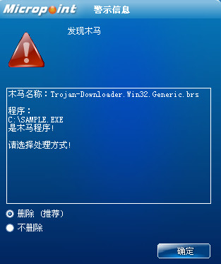如果您已经将微点主动防御软件升级到最新版本,微点将报警提示您发现木马"Trojan-Downloader.Win32.Generic.brs”,请直接选择删除(如图2)。