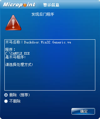 如果您已经将微点主动防御软件升级到最新版本,微点将报警提示您发现木马"Backdoor.Win32.Generic.ve”,请直接选择删除(如图2)。