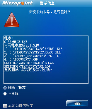 已安装使用微点主动防御软件的用户,无须任何设置,微点主动防御将自动保护您的系统免受该病毒的入侵和破坏。无论您是否已经升级到最新版本,微点主动防御都能够有效清除该病毒。如果您没有将微点主动防御软件升级到最新版,微点主动防御软件在发现该病毒后将报警提示您发现“未知木马”,请直接选择删除处理(如图1)