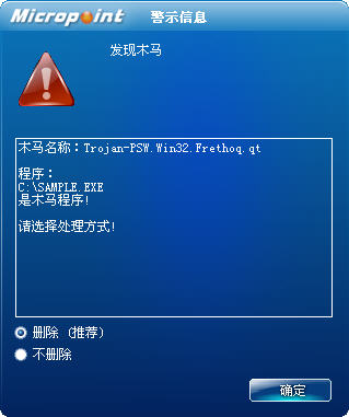 如果您已经将微点主动防御软件升级到最新版本,微点将报警提示您发现木马"Trojan-PSW.Win32.Frethoq.qt”,请直接选择删除(如图2)