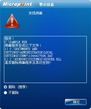 已安装使用微点主动防御软件的用户,无须任何设置,微点主动防御将自动保护您的系统免受该病毒的入侵和破坏。无论您是否已经升级到最新版本,微点主动防御都能够有效清除该病毒。如果您没有将微点主动防御软件升级到最新版,微点主动防御软件在发现该病毒后将报警提示您“发现病毒”,请直接选择删除处理(如图1)