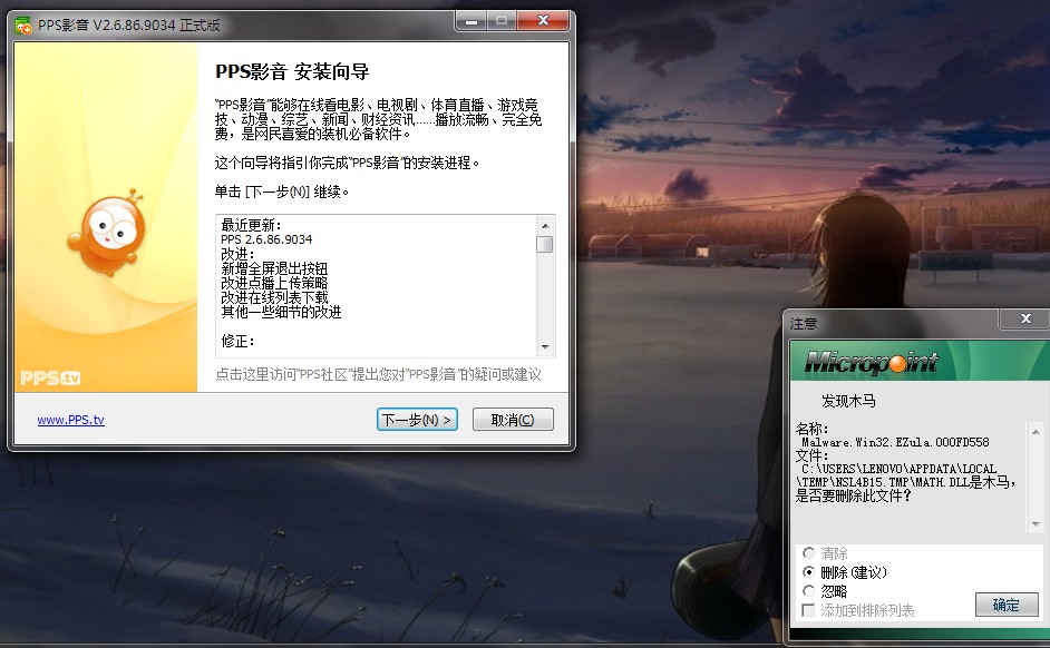 今天通过qq软件管理升级pps的版本,安装时微点杀毒提示发现木马