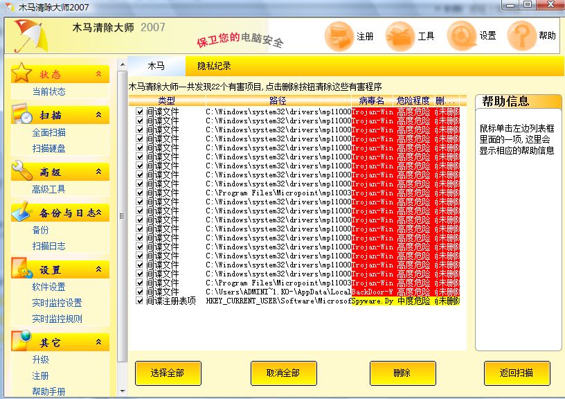 今天用木马清除大师扫描了一下,看了以后吓一跳
