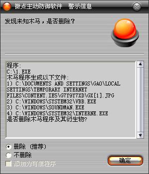 已安装使用微点主动防御软件的用户,无须任何设置,微点主动防御将自动保护您的系统免受该病毒的入侵和破坏。无论您是否已经升级到最新版本,微点主动防御都能够有效清除该病毒。如果您没有将微点主动防御软件升级到最新版,微点主动防御软件在发现该病毒后将报警提示您发现“未知木马”,请直接选择删除处理(如图1);