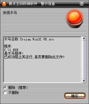 如果您已经将微点主动防御软件升级到最新版本,微点将报警提示您发现" Trojan.Win32.VB.cro”,请直接选择删除(如图2)。