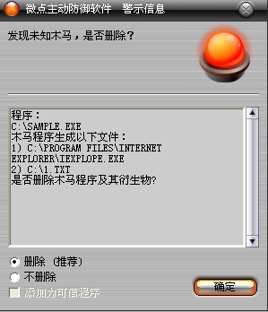 图1 微点主动防御软件自动捕获未知病毒(未升级)