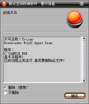 如果您已经将微点主动防御软件升级到最新版本,微点将报警提示您发现木马"Trojan-Downloader.Win32.Agent.bxan”,请直接选择删除(如图2)。