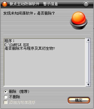 已安装使用微点主动防御软件的用户,无须任何设置,微点主动防御将自动保护您的系统免受该病毒的入侵和破坏。无论您是否已经升级到最新版本,微点主动防御都能够有效清除该病毒。如果您没有将微点主动防御软件升级到最新版,微点主动防御软件在发现该病毒后将报警提示您发现“未知间谍”,请直接选择删除处理(如图1)