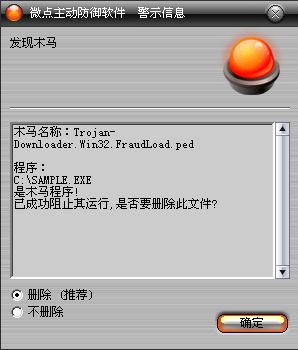 如果您已经将微点主动防御软件升级到最新版本,微点将报警提示您发现木马"Trojan-Downloader.Win32.FraudLoad.ped”,请直接选择删除(如图2)。
