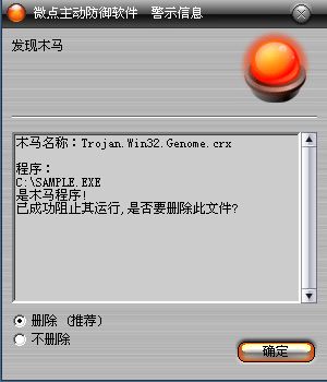 如果您已经将微点主动防御软件升级到最新版本,微点将报警提示您发现木马"Trojan.Win32.Genome.crx”,请直接选择删除(如图2)。