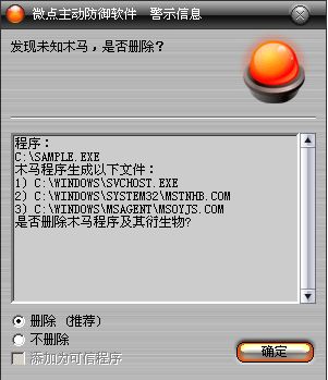 已安装使用微点主动防御软件的用户,无须任何设置,微点主动防御将自动保护您的系统免受该病毒的入侵和破坏。无论您是否已经升级到最新版本,微点主动防御都能够有效清除该病毒。如果您没有将微点主动防御软件升级到最新版,微点主动防御软件在发现该病毒后将报警提示您发现“未知木马”,请直接选择删除处理(如图1)