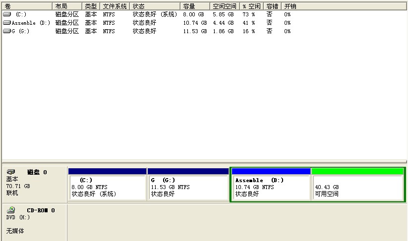 今天突然发现我的两个分区不见了,昨天没注意,前天还用过了。原来硬盘分为C、D、E、F四个盘。后用分割工具把C盘割了10G出来(为G)。C盘为系统盘,D盘为软件安装盘,E盘为资料盘(我的重要资料都在里面),E、G为娱乐盘,放些电影歌曲什么的。现在E、F不见了。通过微点技术人员探讨,电脑未发现异常!