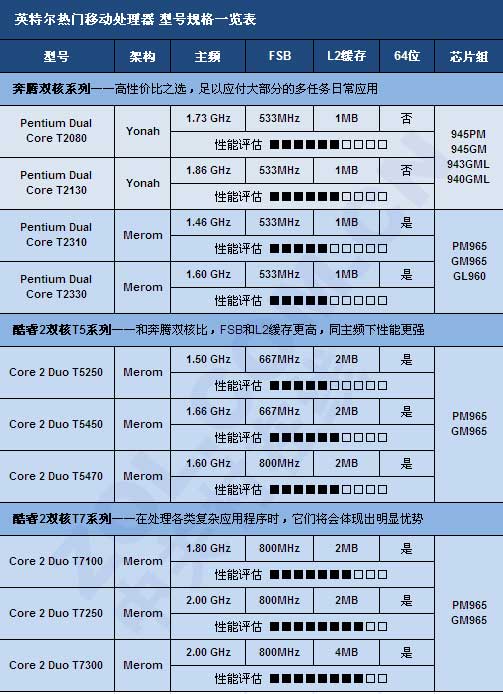 总之,我们在考察笔记本的硬件配置时,还是应该从自己的实际需要出发,选择适合自己的产品。对普通用户而言,奔腾双核的性能已经能够满足绝大多数的日常应用,酷睿2双核则在相同主频下拥有更好的性能、以及更为智能化的电源管理技术。