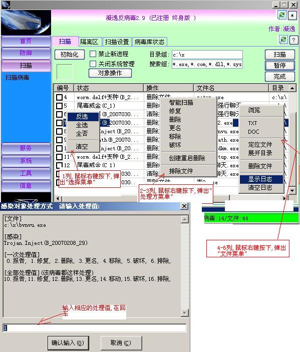 [病毒库]>>选择病毒样本>>单击"[扫描]"进行搜索清理