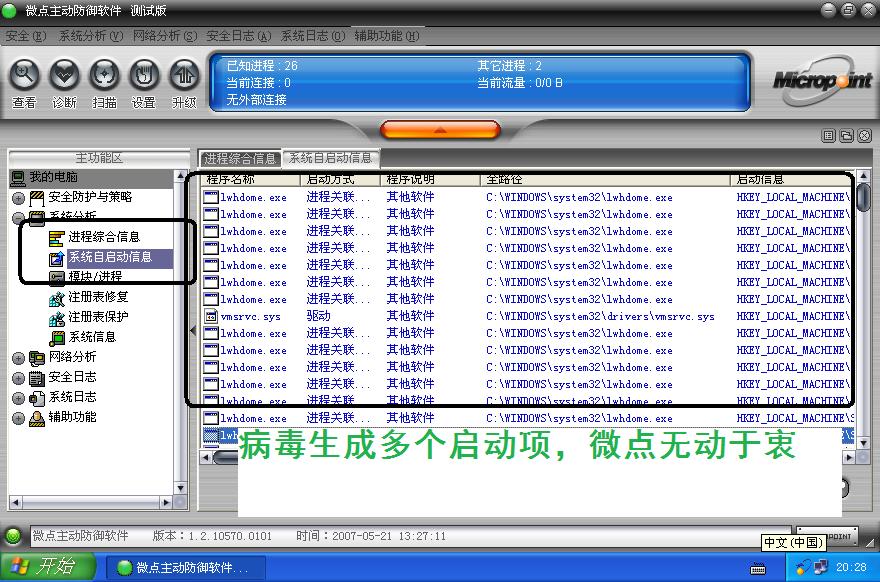 因为我在虚拟机中喜欢养毒,中的病毒太多了,不知道有没有漏发,我测试了几次,微点进程确实给杀得干干净净