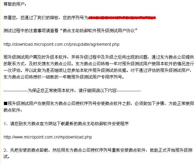 谢谢您的支持,建议您按照邮件的提示卸载您原来的版本,然后到微点官方网站下载最新试用版本安装包,重新安装,并在安装过程中第四步骤输入您收到的预升级序列号安装注册即可。