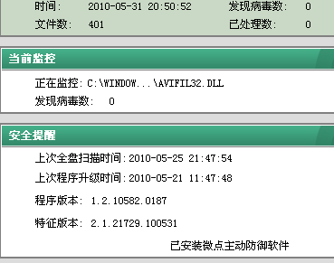 楼主,你看见下面那个特征版本没有,后面有个531,表明特征库已经升级到5月31号了,所以是最新的了,微点杀毒基本是一天一升,默认情况下自动升级。