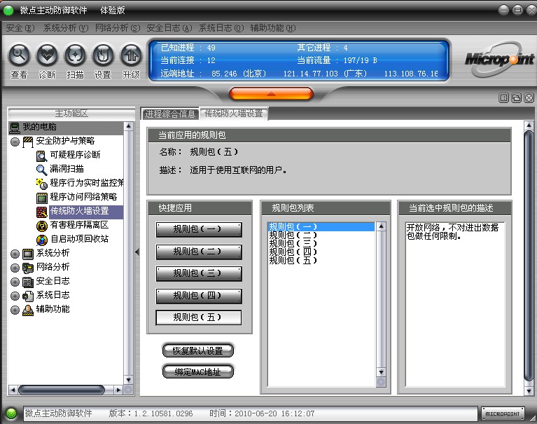 3.微点主动防御软件的防火墙默认的五个规则包是根据不同的网络环境制定的,微点防火墙默认开启的是规则包一,如您需要使用其他规则包请您这样操作一下(微点主界面--安全防护与策略--传统防火墙设置)